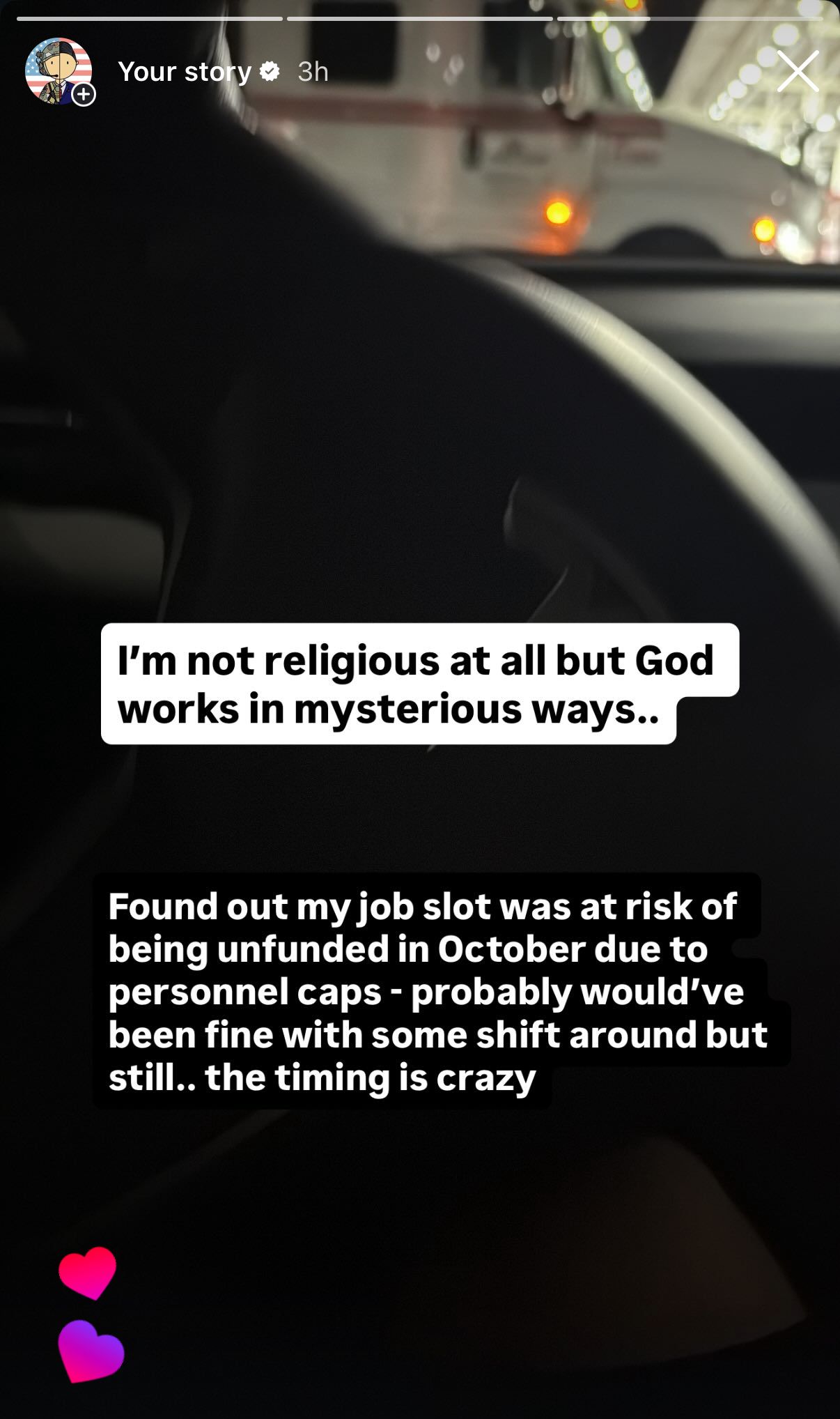 Then that person in HR said that my spot was on the list to be unfunded in the next fiscal year (October 1st).